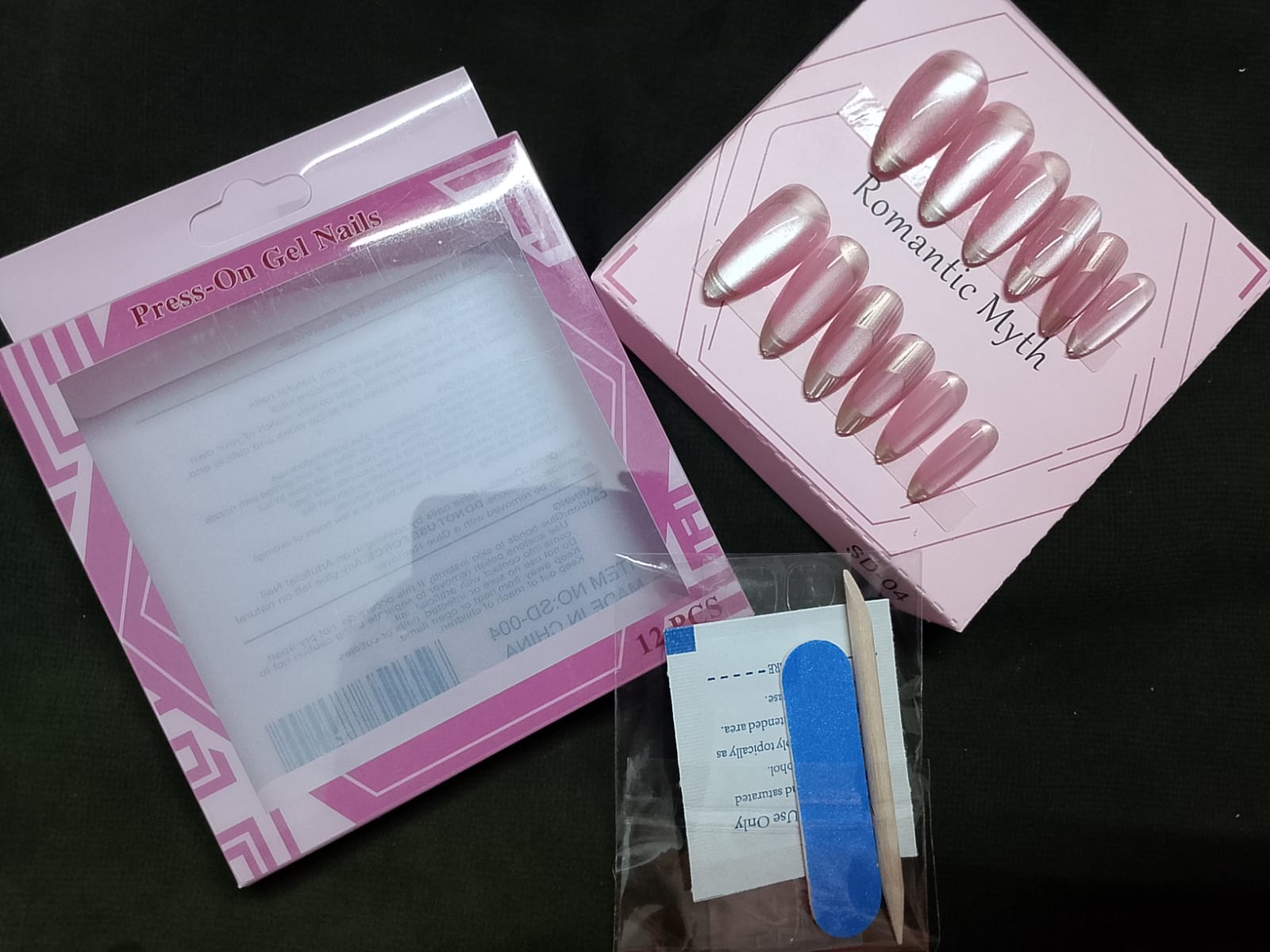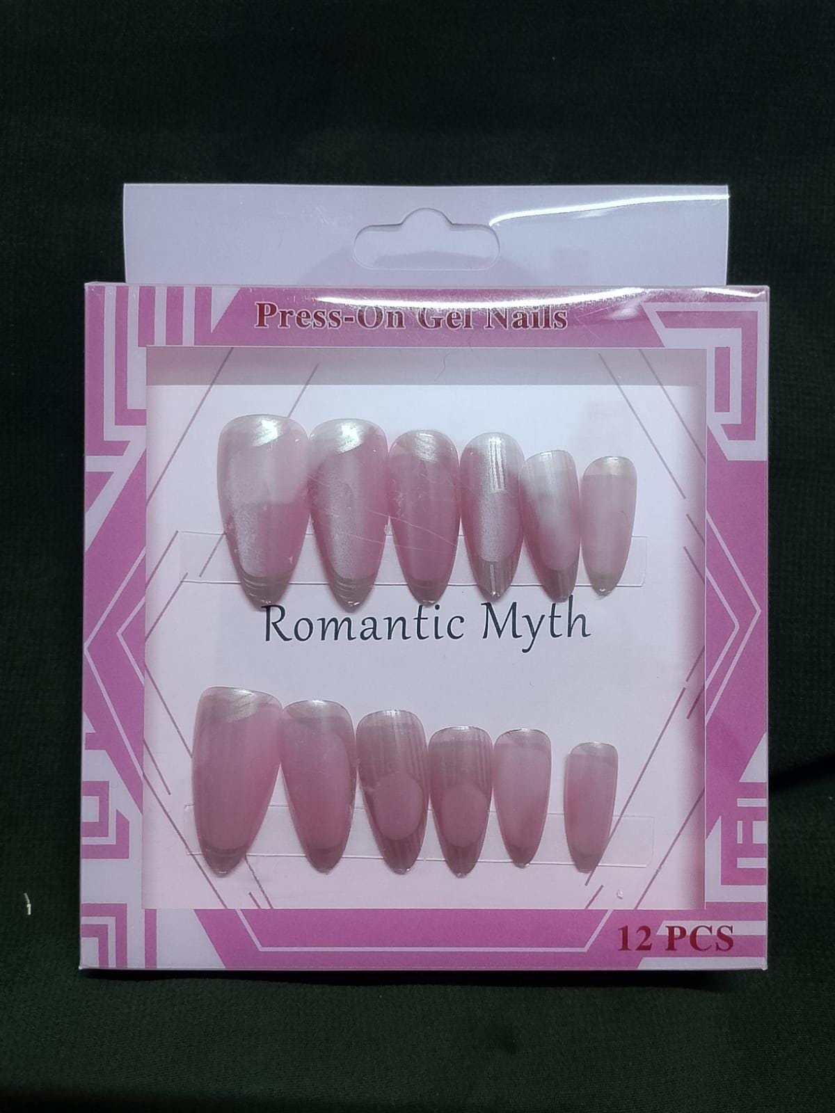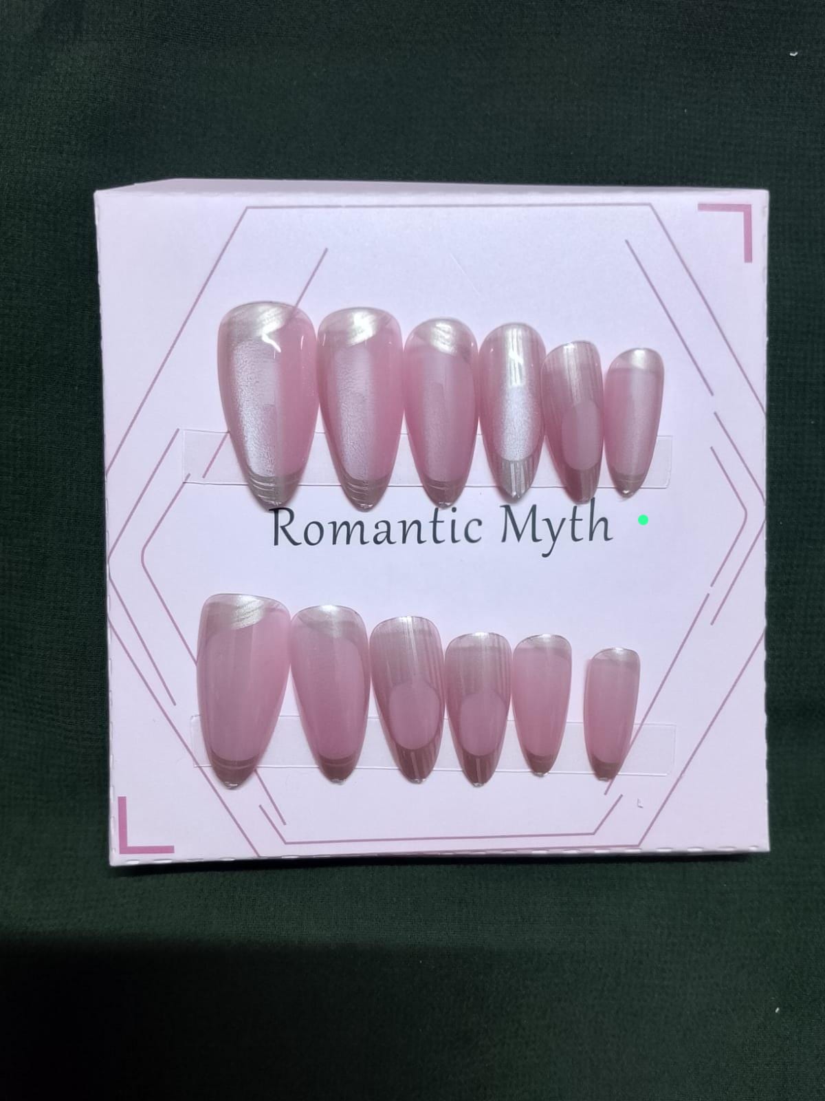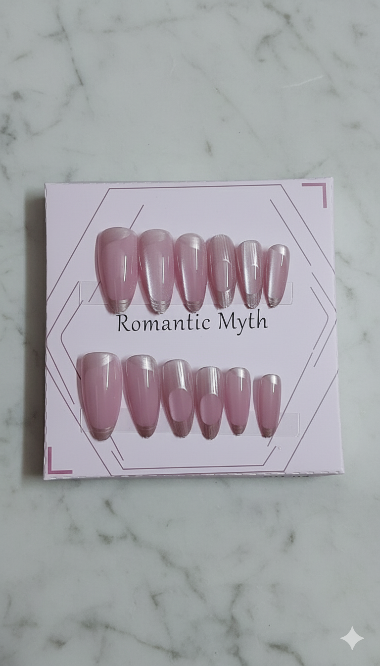 • Color/Finish: The nails have a soft, semi-transparent light pink or blush base. They feature a beautiful “cat-eye” or iridescent/pearlescent shimmer finish.