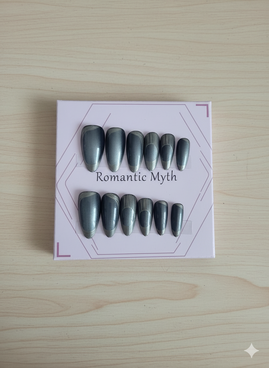 Color and Finish: The nails are primarily deep silver/slate grey with a smooth, shiny gel finish.