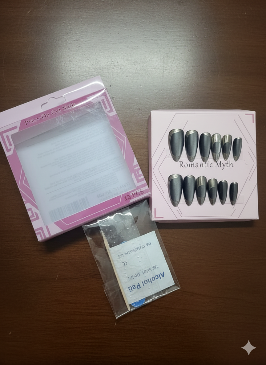 This is an attractive BLACK Press-On Gel Nails, presented under the name ‘Romantic Myth’. The set contains a total of 12 pieces, including various sizes for different fingers.