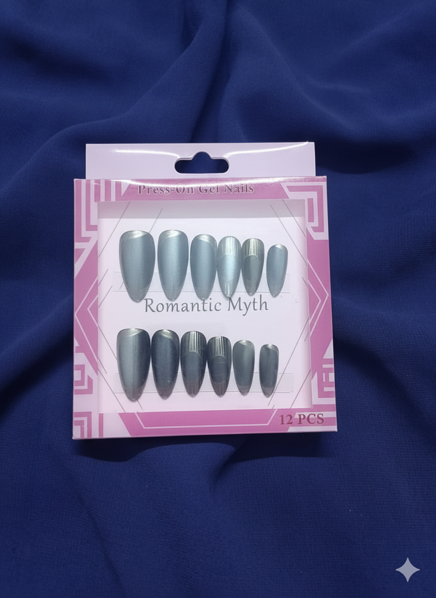 Plain Nails: The nails in the top row are uniform, featuring a metallic silver/grey color.