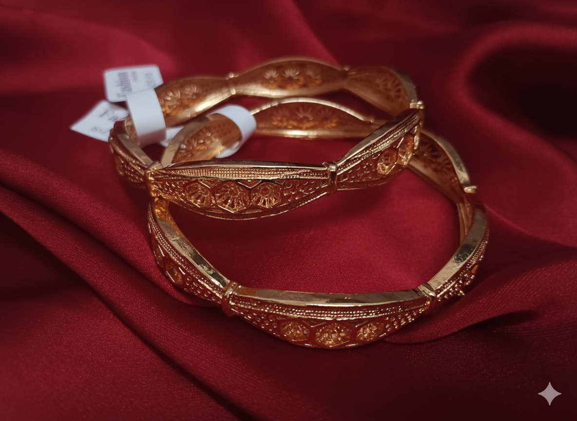 Design & Pattern: The central band of each bangle showcases a repeating pattern of interconnected, stylized floral or geometric motifs, bordered by raised, ribbed gold detailing. The edges are finished with a fine, rope-like or bead-set texture, giving the pieces an ornamental and structured appearance. The overall look is intricate and luxurious, suggestive of skilled artisan work.