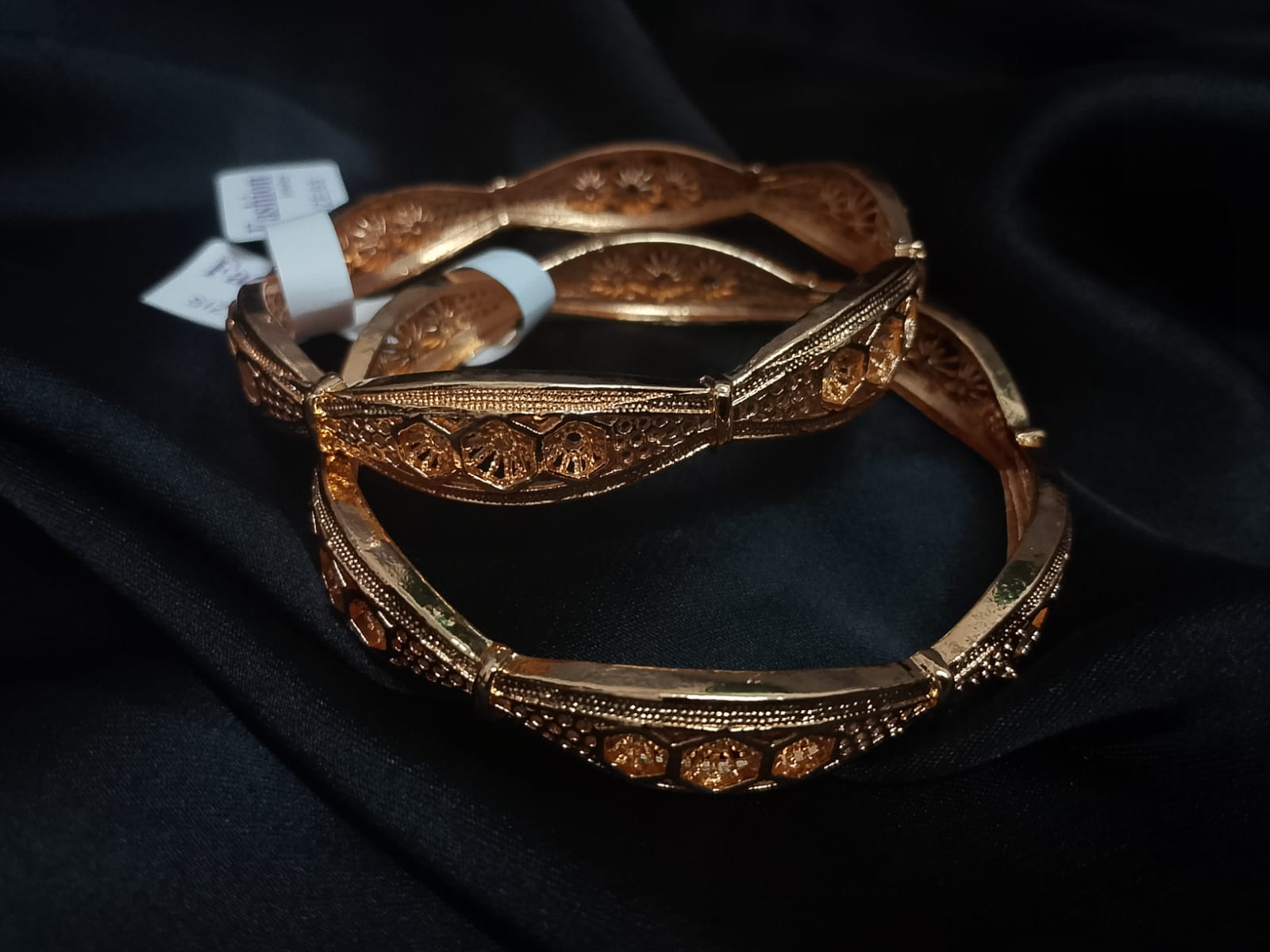 Context: The bangles are photographed resting on a piece of deep burgundy or maroon satin/silk fabric, which dramatically highlights the warmth and brilliance of the gold. A small white tag (likely a price or inventory tag) is visible, indicating that they are new retail items.