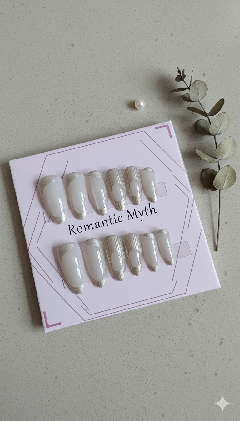 Step into a world of elegance with these captivating press-on nails. Featuring a sophisticated almond shape, the base boasts a delicate, creamy pearlescent white finish that shifts beautifully in the light, reminiscent of fine opal or the soft glow of the moon.