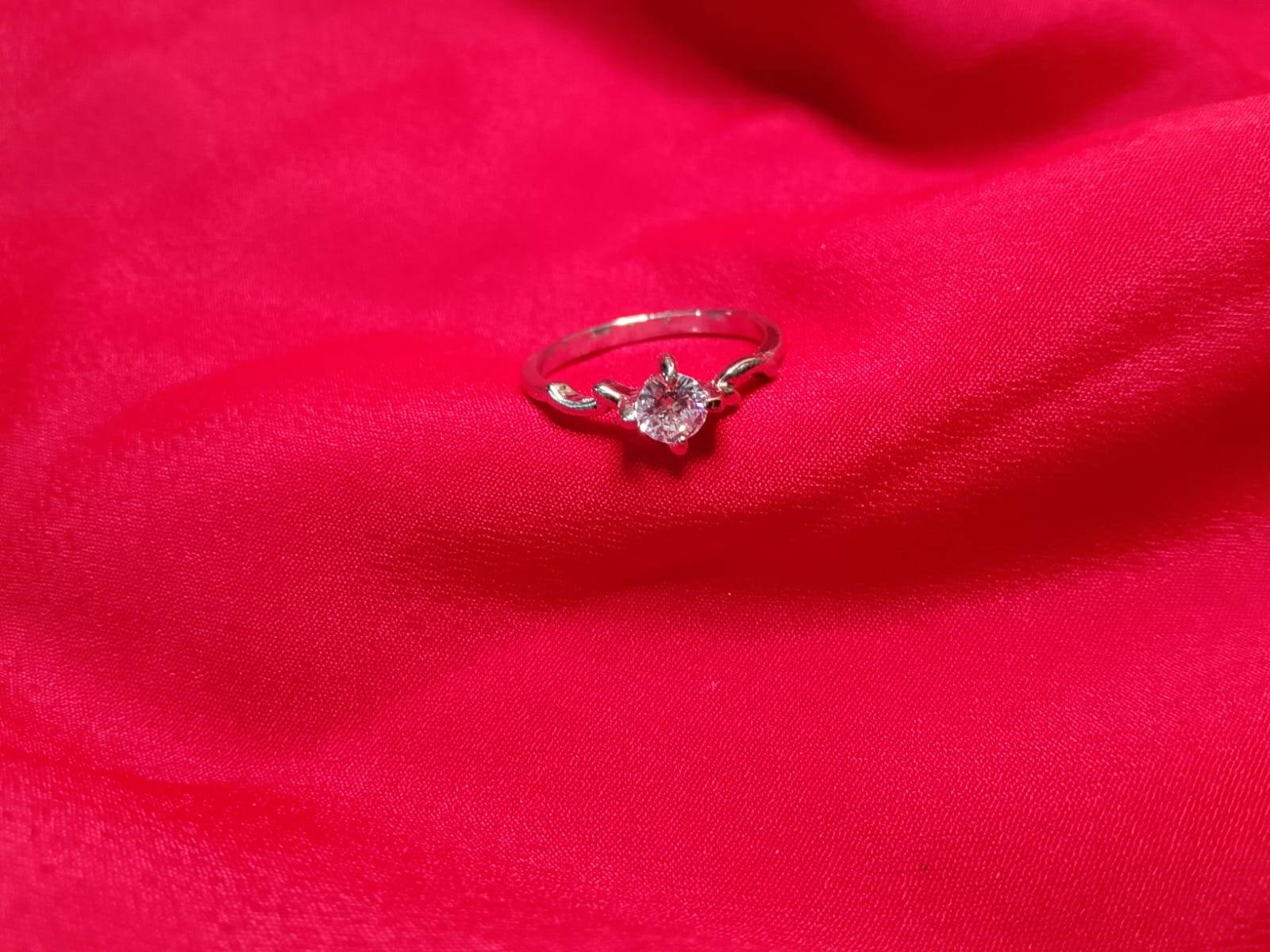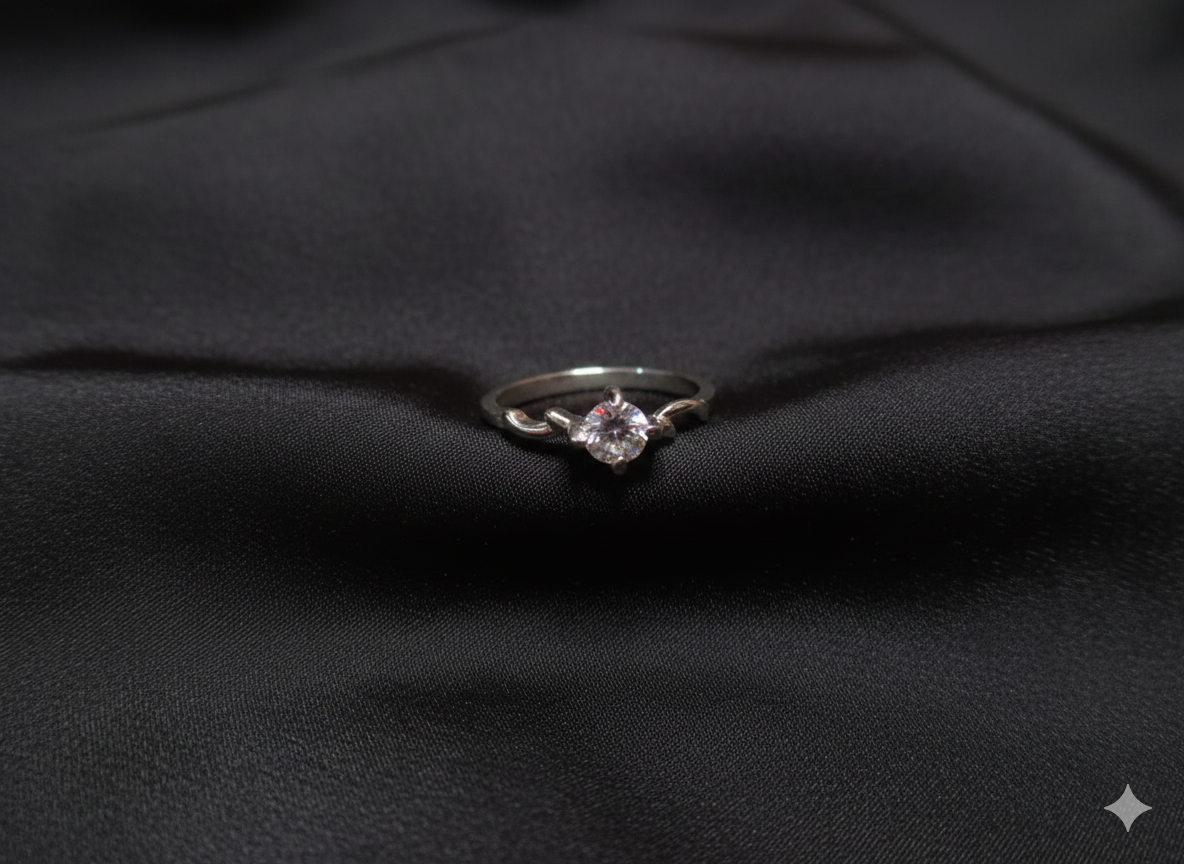 The focal point is a dazzling, brilliant-cut cubic zirconia (or diamond/moissanite, depending on the stone), meticulously selected for its exceptional clarity and fire. This radiant stone is securely set within a beautiful, sweeping gallery setting. The band’s exquisite, flowing lines appear to gently embrace the stone, symbolizing two lives intertwined. Crafted in polished sterling silver (or white gold), the ring feels substantial yet comfortable for everyday wear.